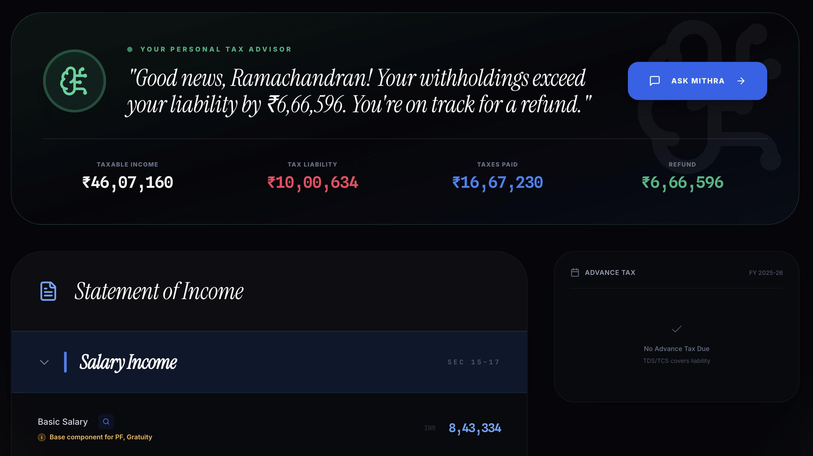 Your personal AI financial companion. We connect income, taxes, investments, and decisions into one intelligent view.